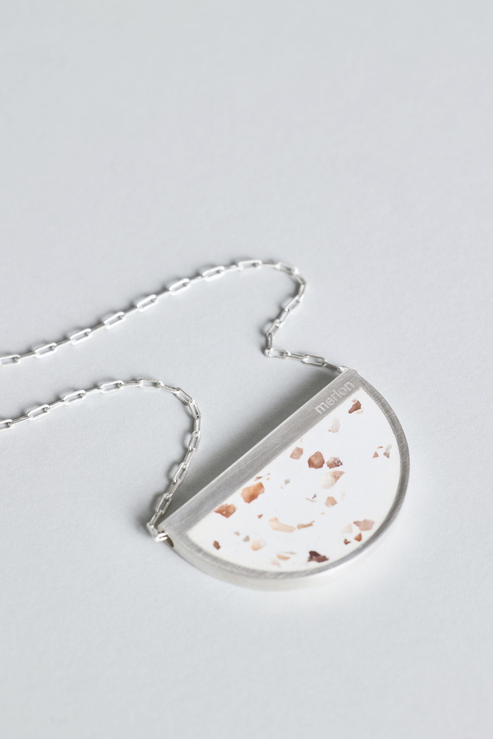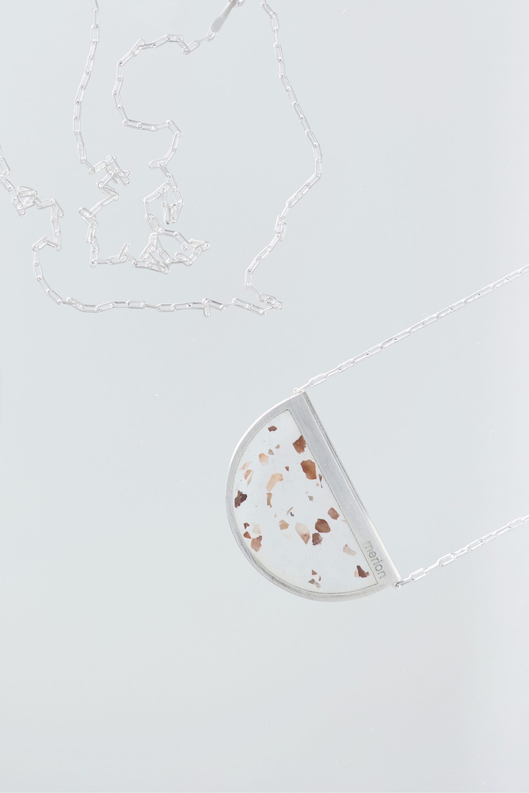 Exedra is inspired by the semi-circular seating niches found in classical public architecture. The concrete surface is framed by silver, while the chain passes through a vaulted channel at the top, giving the sense of a form integrated within a structural opening.