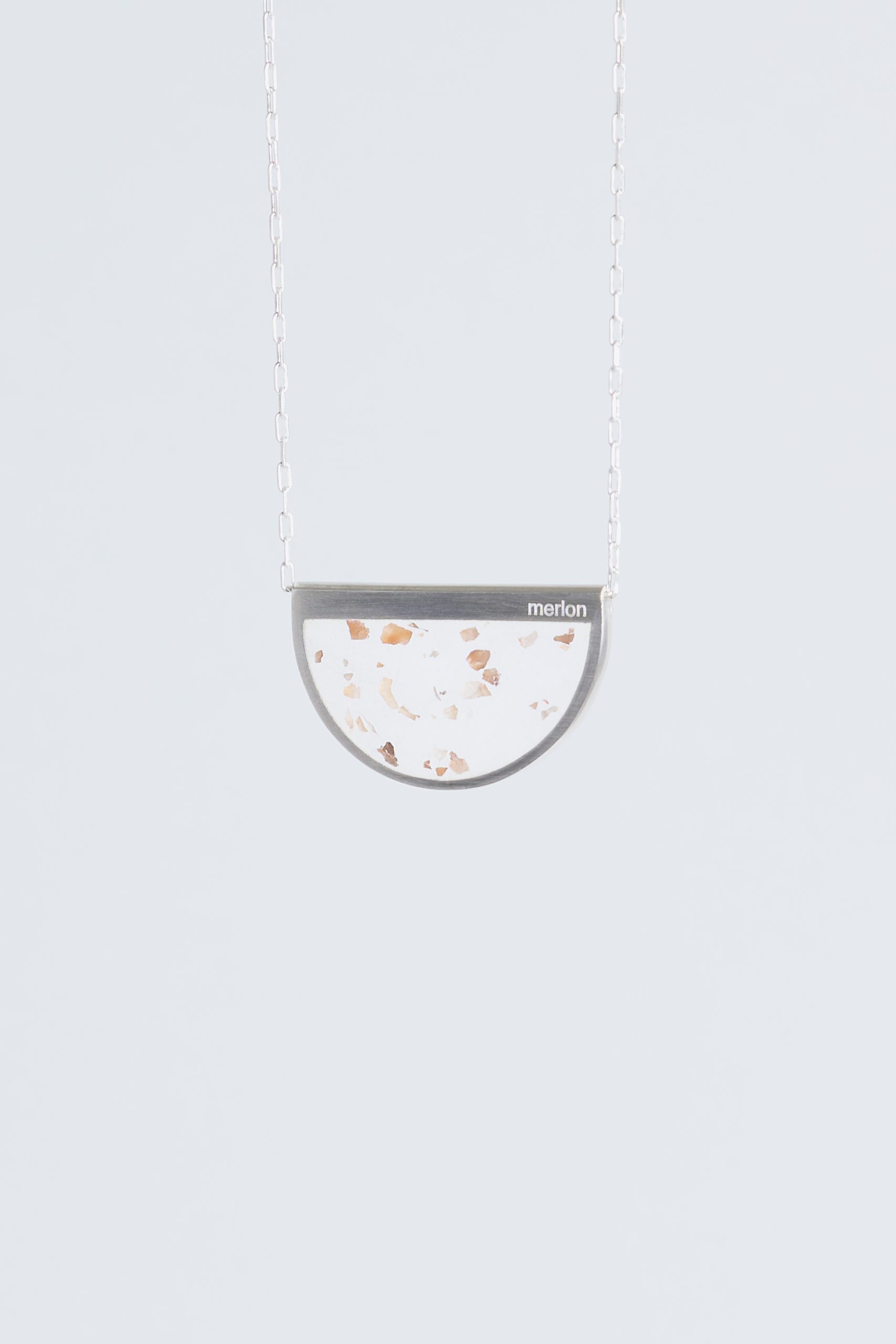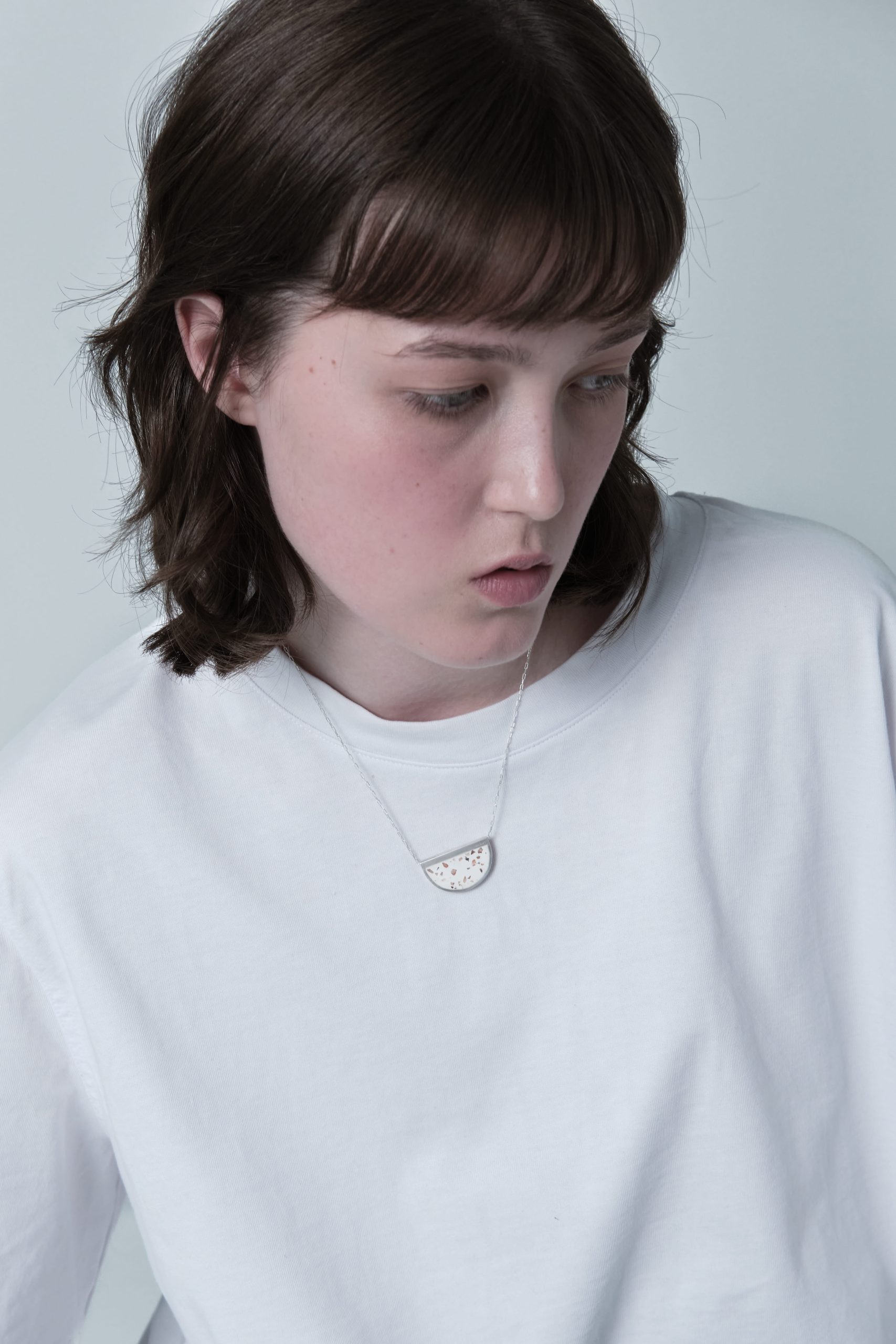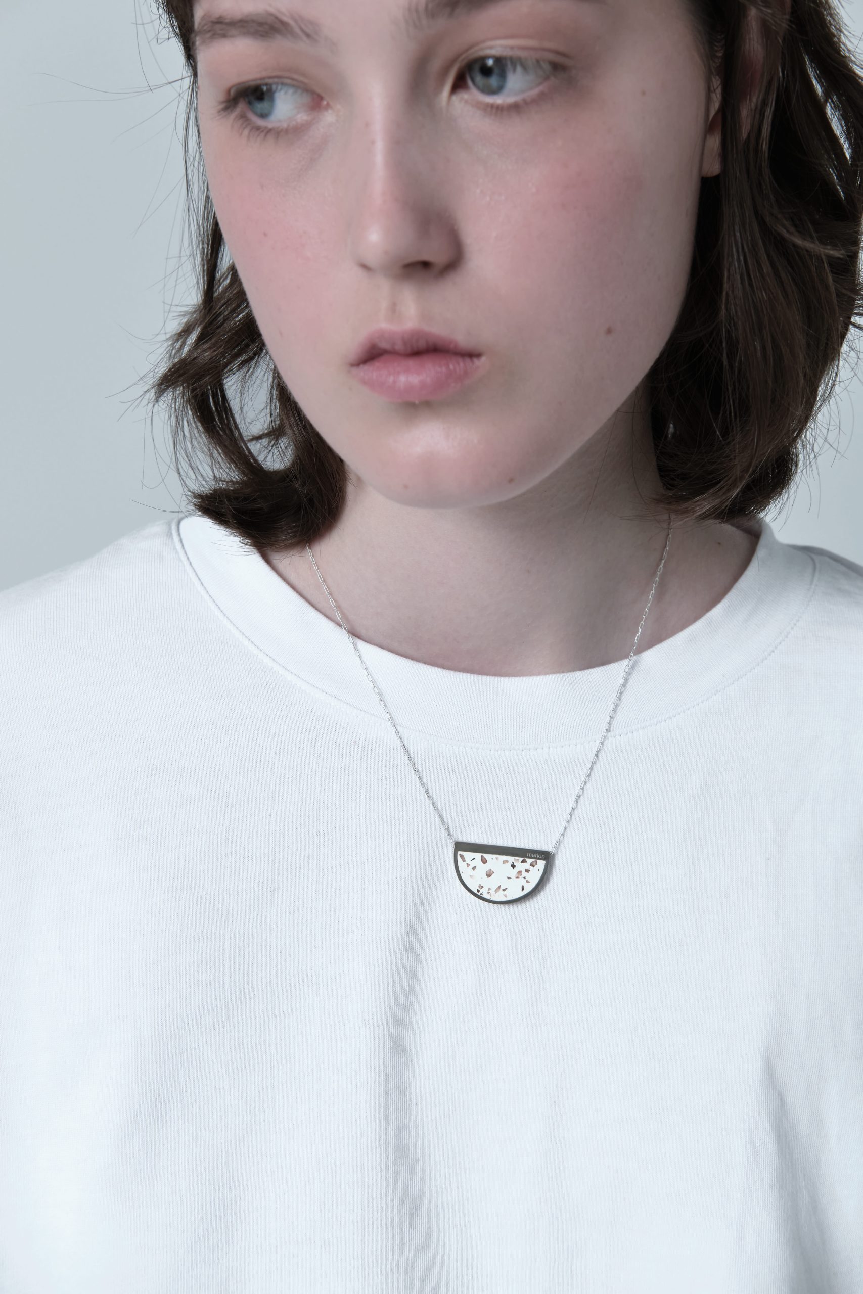 Its curved body feels like a fragment removed from a larger architectural surface. Exedra brings together the inward lines of architecture with a suspended, wearable detail, capturing the balance between structure and space.
