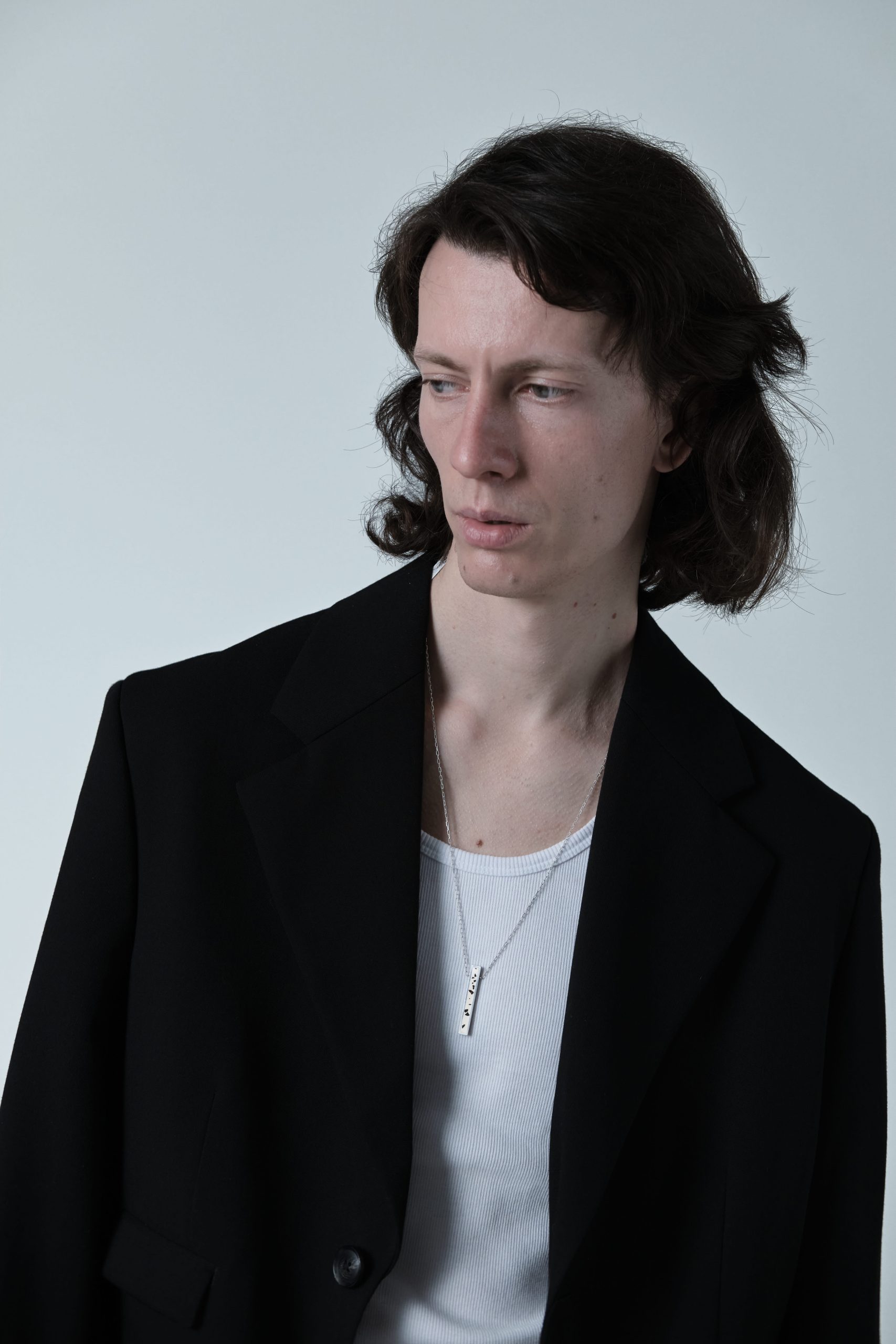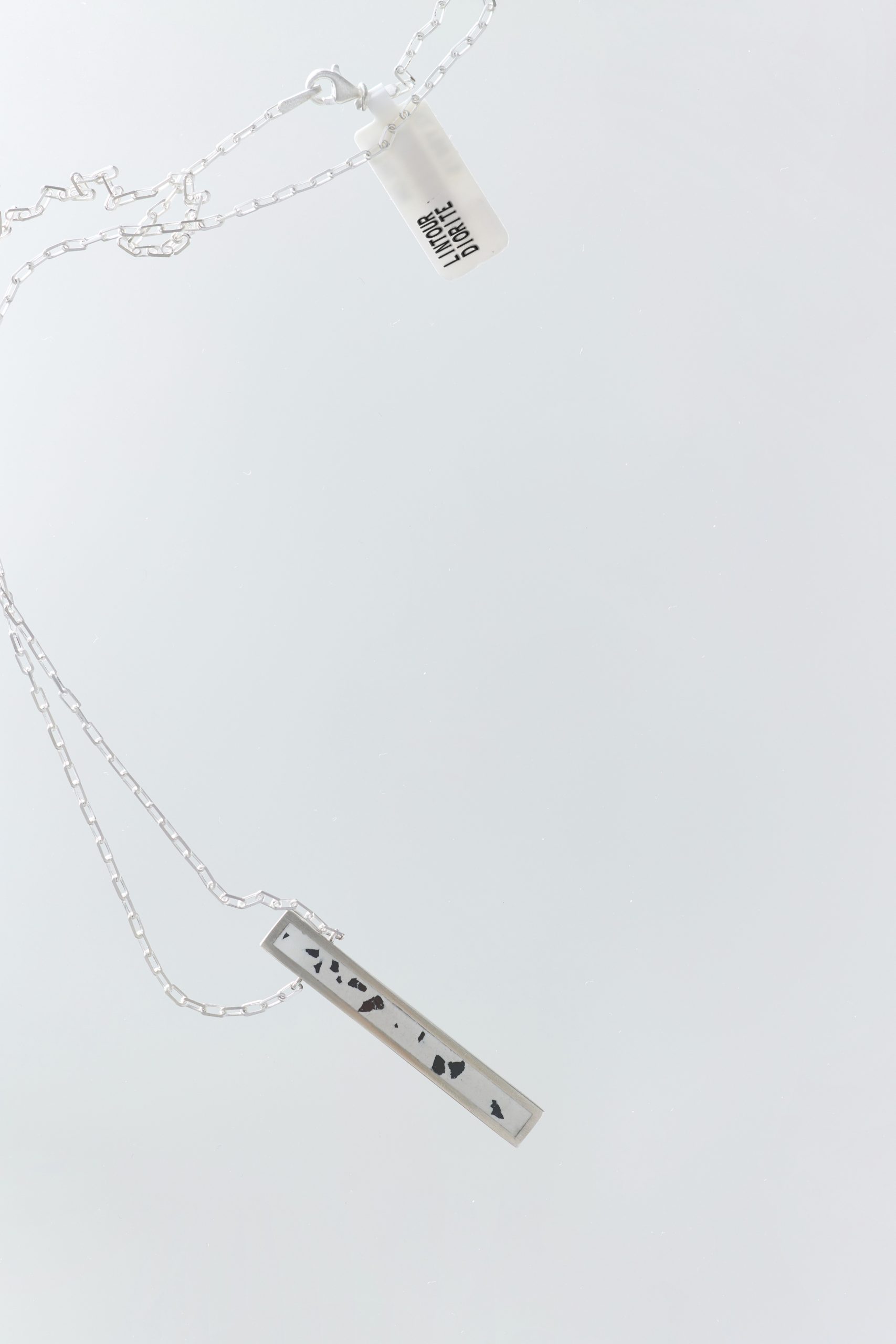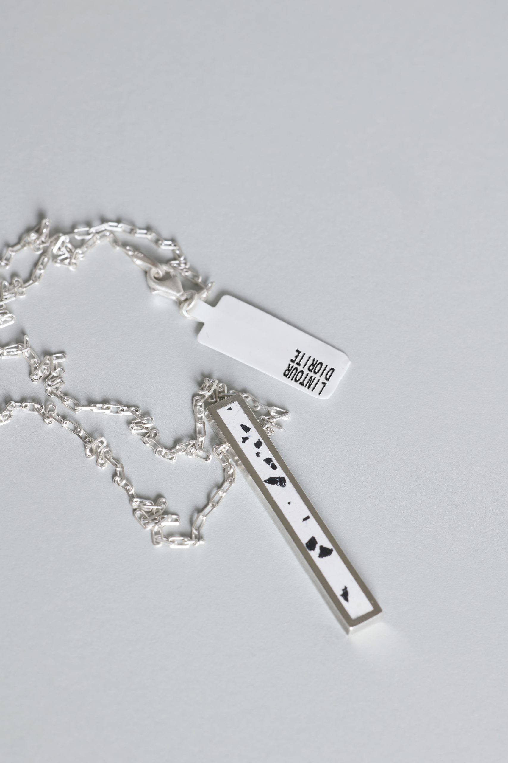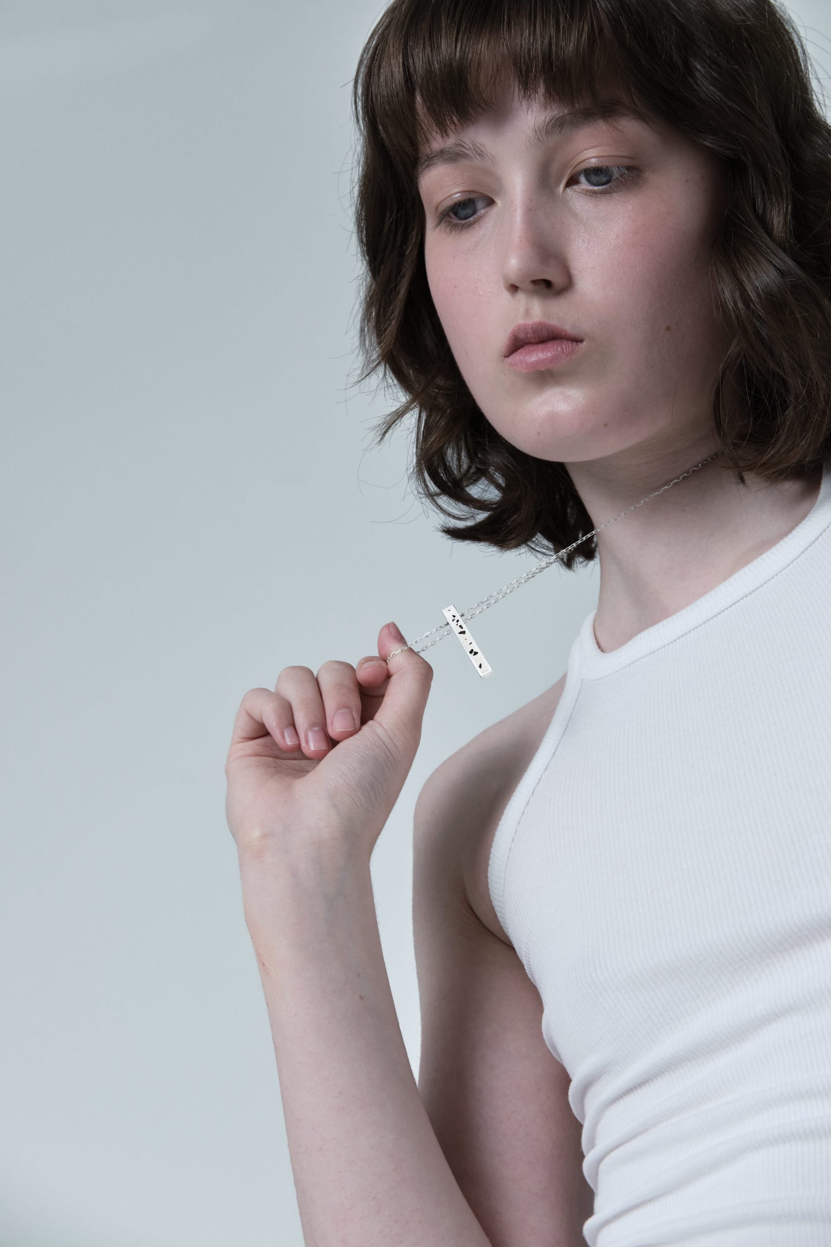 The chain attaches at the upper edges of the piece, giving it the appearance of being directly supported rather than suspended. Lintour brings minimal architectural lines into a wearable, tangible form.