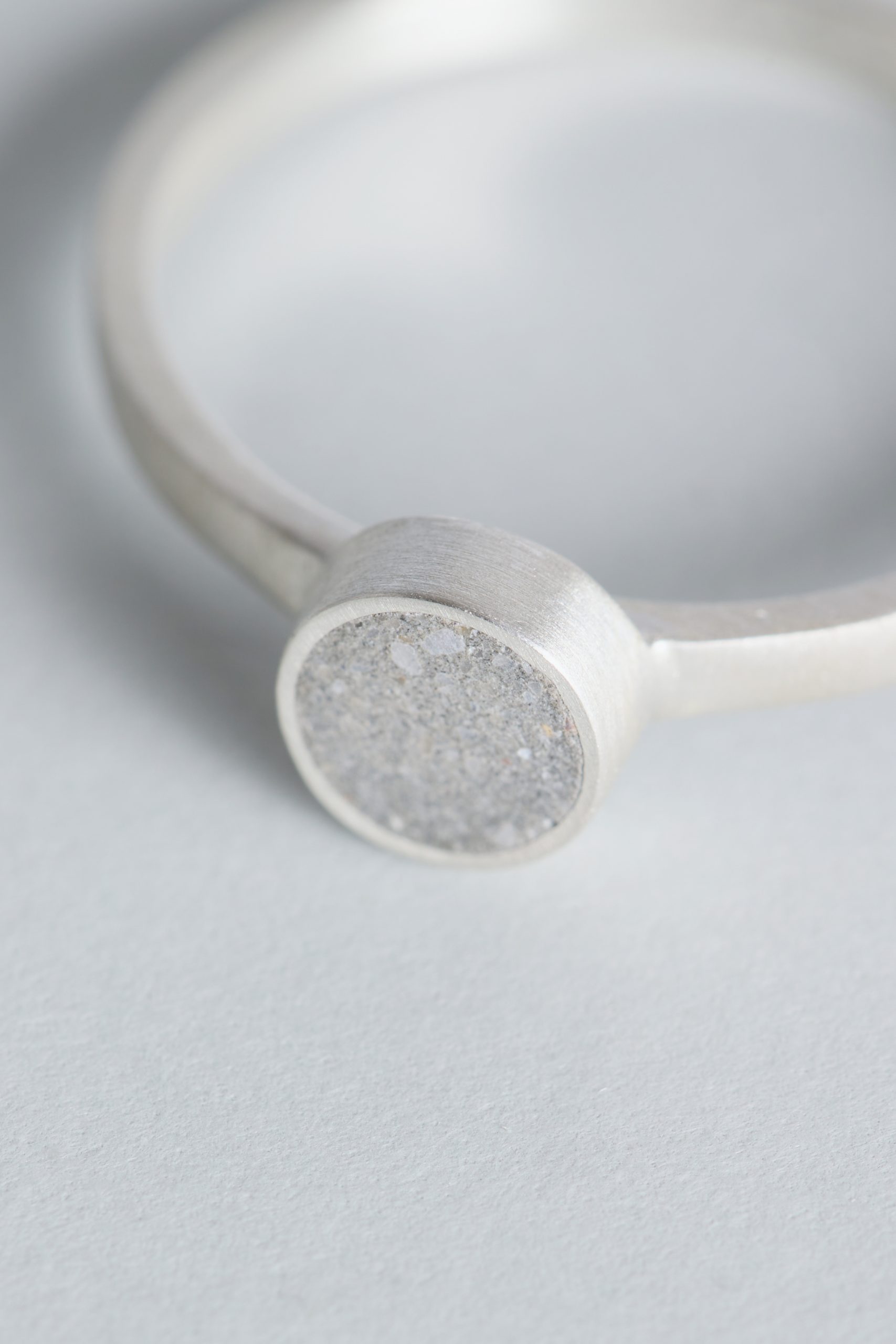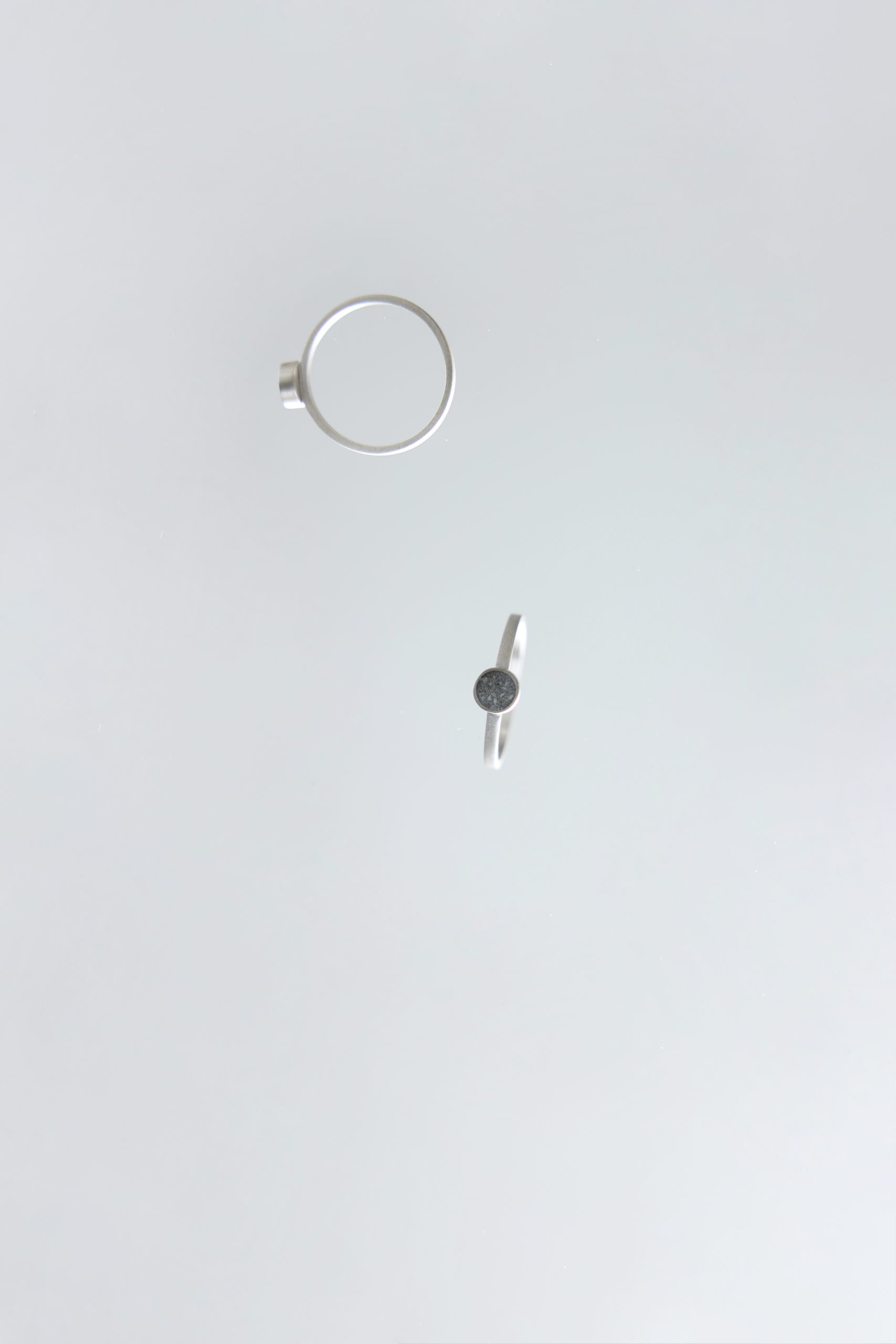 Mirvett features a slender silver band crowned with a circular concrete form. Minimal yet striking, the design recalls architectural elements such as an oculus or recessed void, drawing the eye to its centered surface.