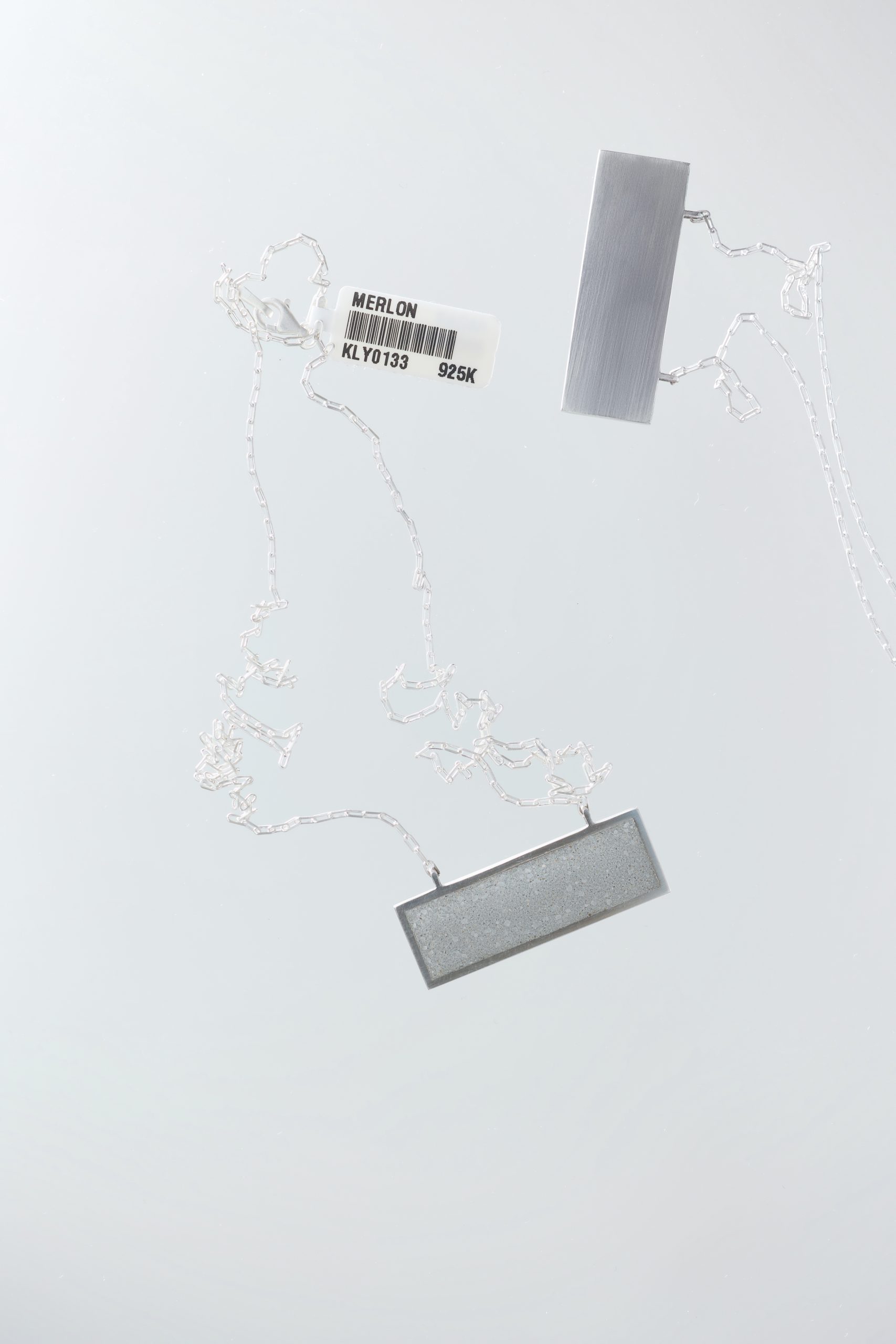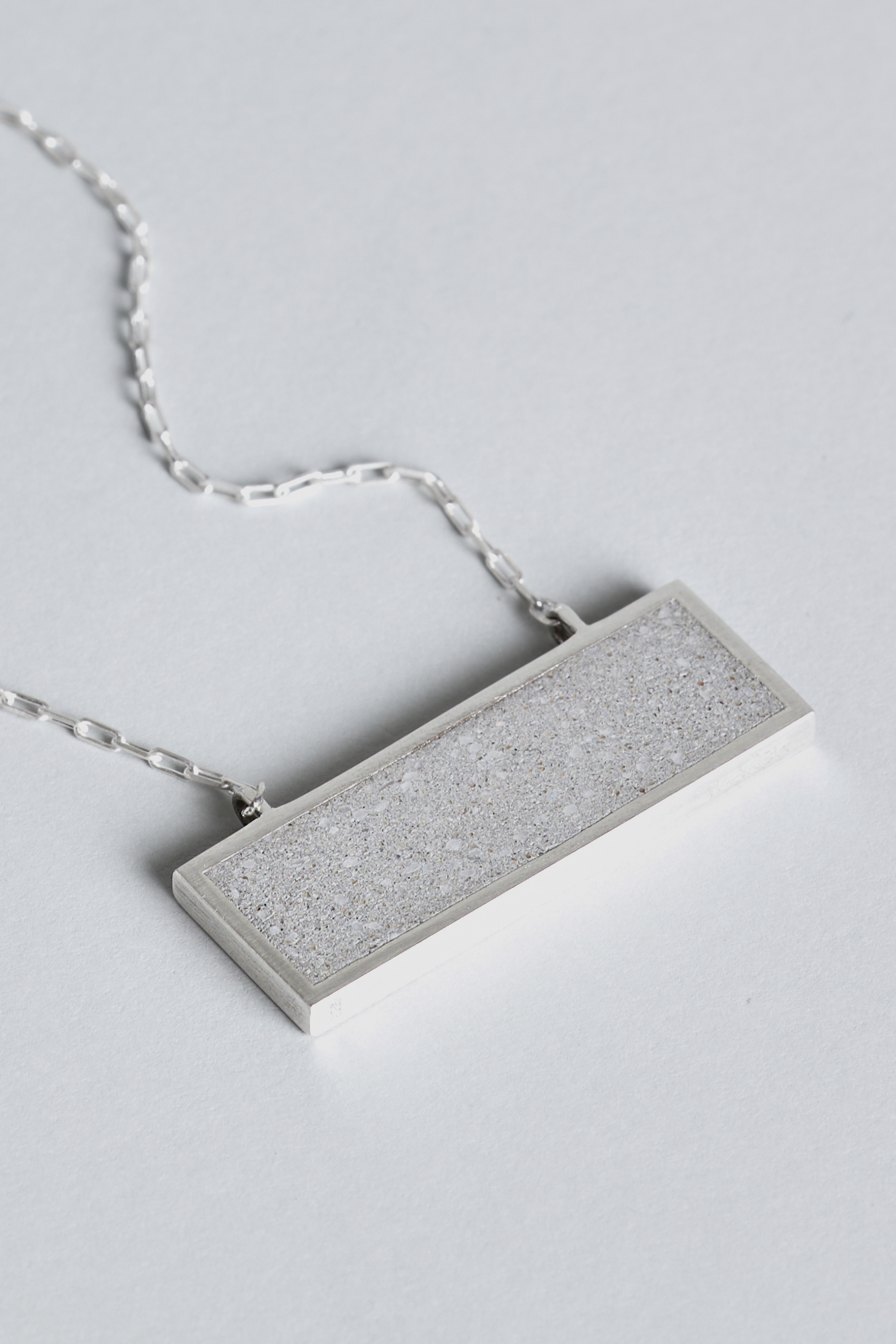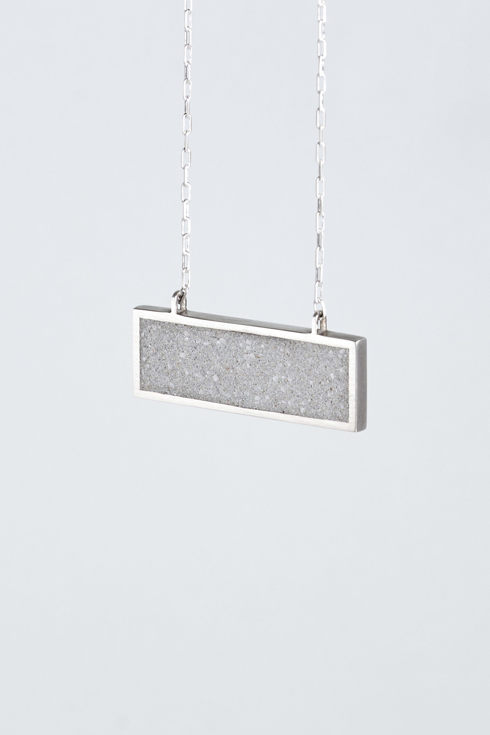 Panvell draws inspiration from architectural lintels and suspended slabs. Its broad rectangular concrete form is framed in silver and anchored by chains at both ends.
