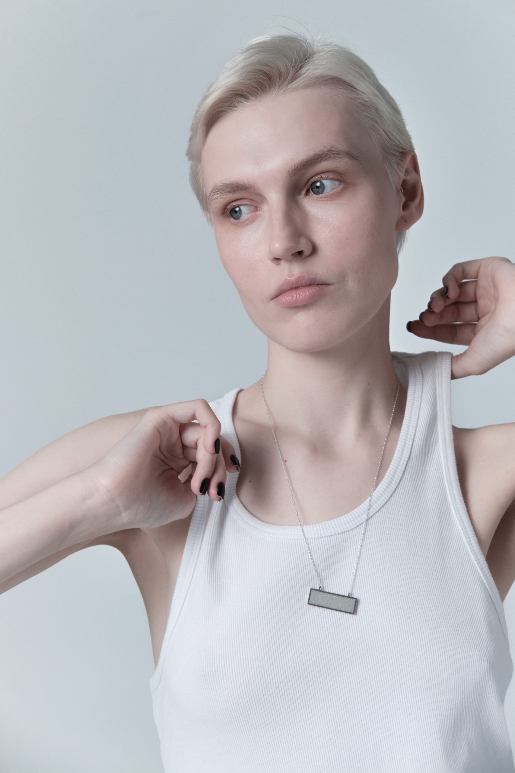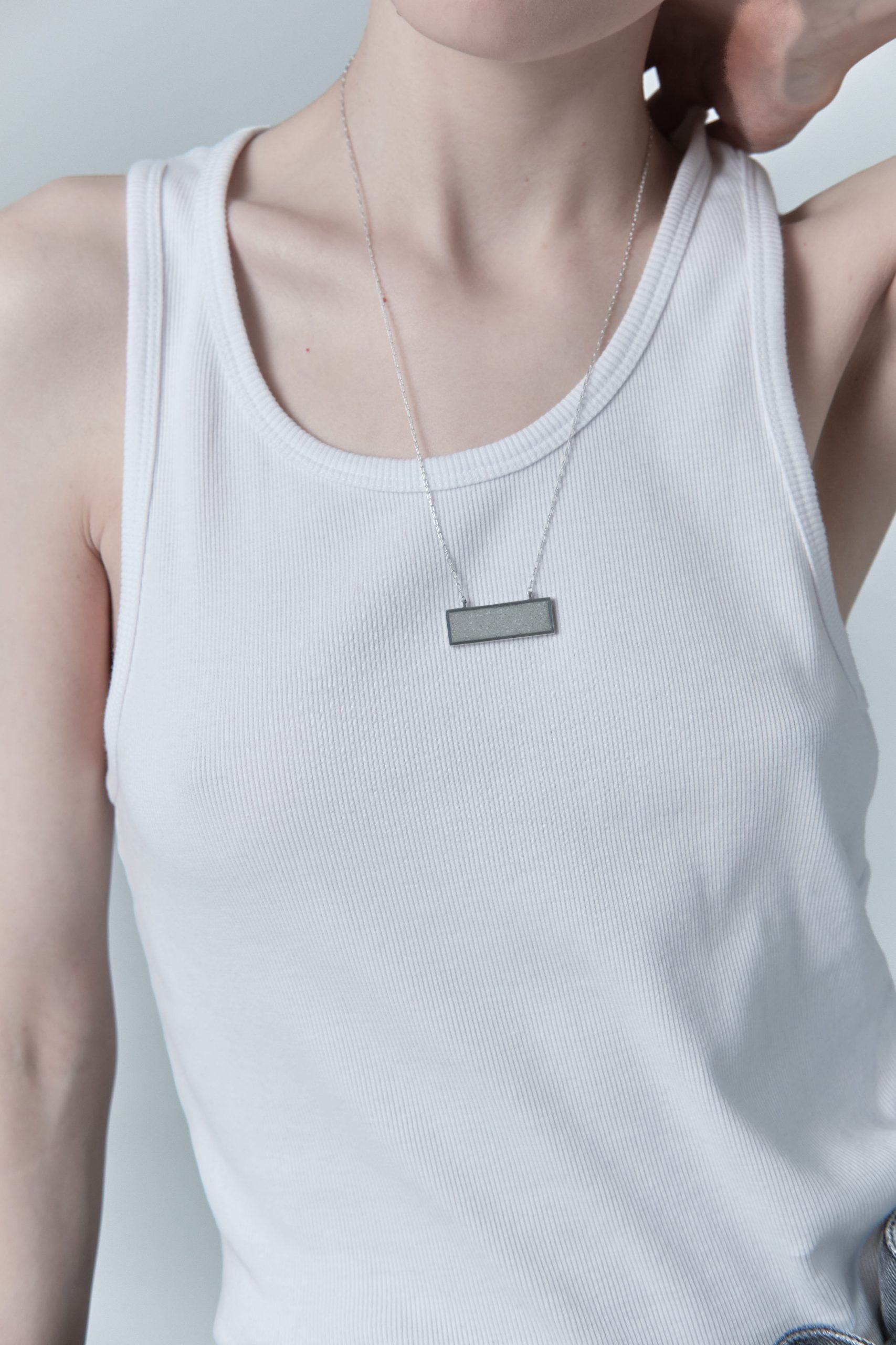 The pendant creates the impression of weight stretched across a span, balancing between two fixed points. Panvell embodies a structural language, reduced and reinterpreted at a wearable scale.